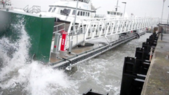 The service boats of a wind farm operator are prepared for use at this pontoon in Barrow-in-Furness, Great Britain. For this purpose, diesel lines as well as hoses and cables for Lenz pumps are routed from the land onto the pontoon. A 20 metre e-chain® from the 1640 series from igus was used to protect these reliably from damage in this rough environment. This even routes the 100 millimetre thick fuel lines safely to where they are required, and is completely insensitive to salty air and rough sea.